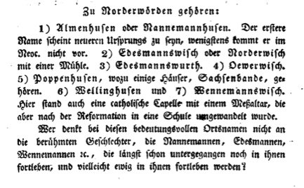 Wer denkt bei diesen bedeutungsvollen Ortsnamen nicht an die berühmten Geschlechter, die Nannemannen, Edesmannen, Wennemannen etc., die längst schon untergegangen noch in ihnen fortleben, und vielleicht ewig in ihnen fortleben werden?"